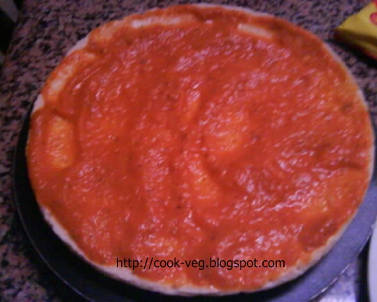 Coloque o molho sobre a base de pizza.
